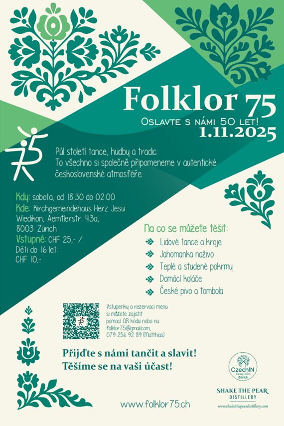 V sobotu, dne 1. listopadu 2025, si mezinárodní česká a slovenská folklórní skupina Folklor 75 připomene 50 let od svého vzniku. Přijďte tuto událost oslavit s námi!