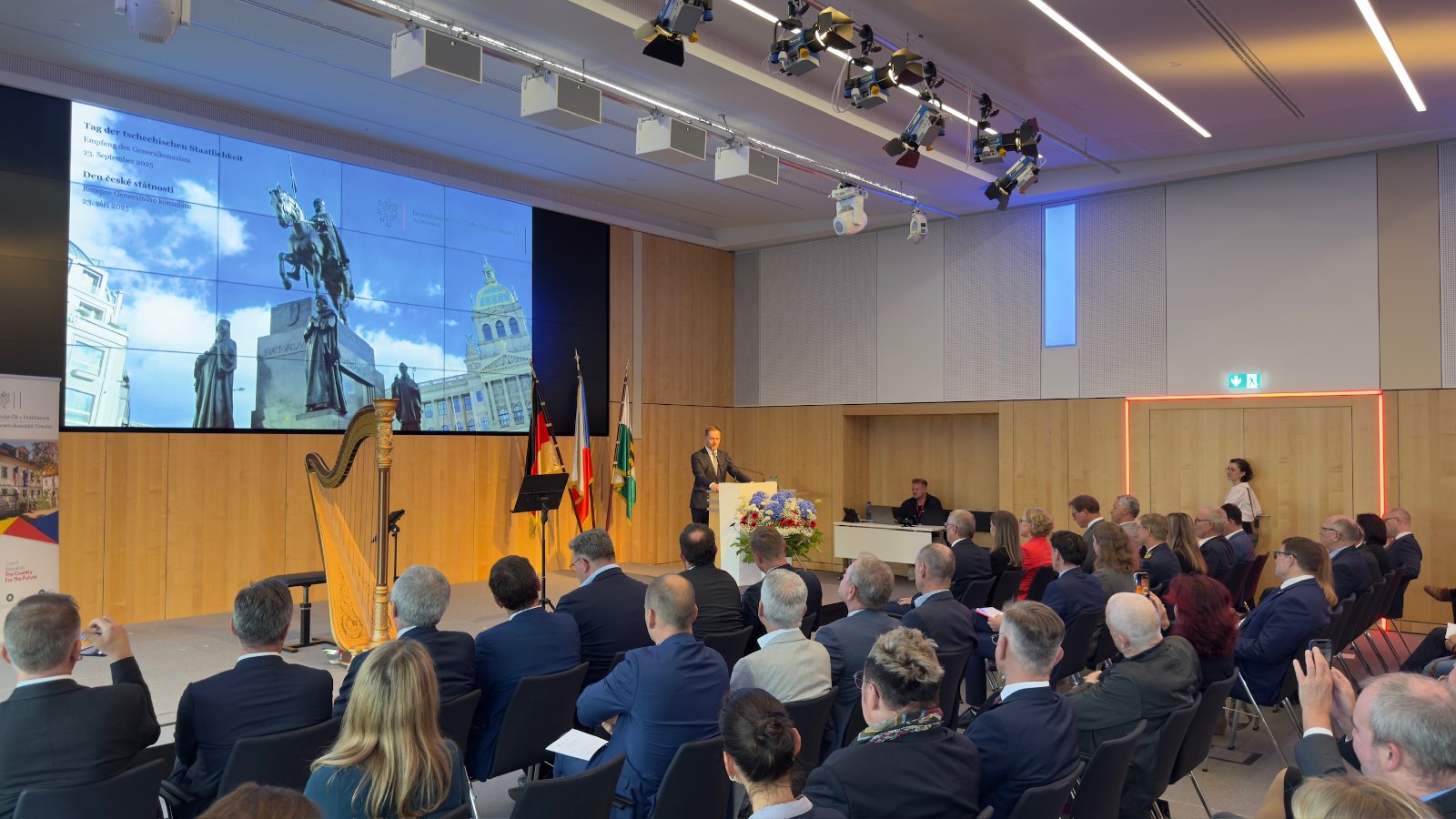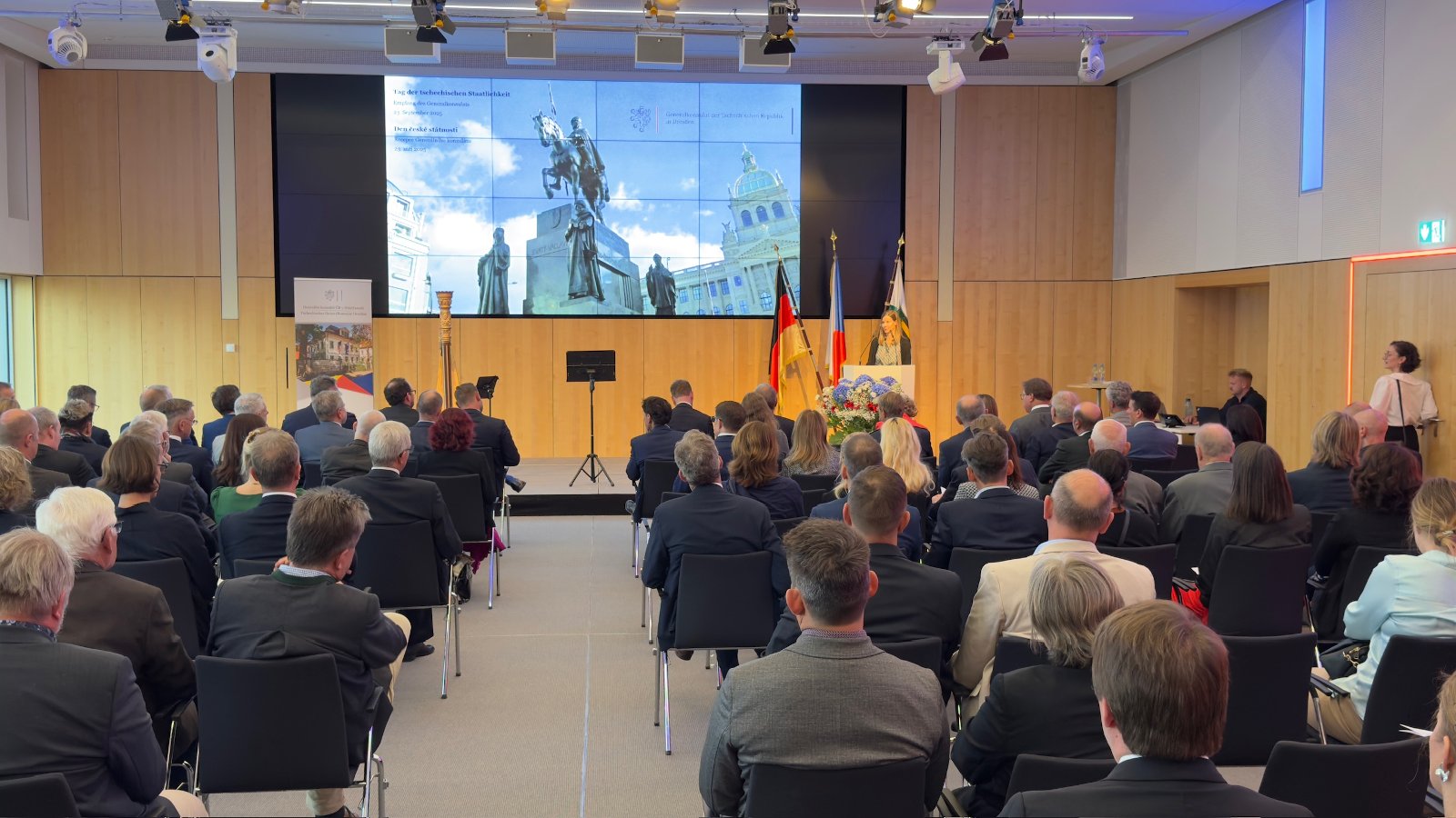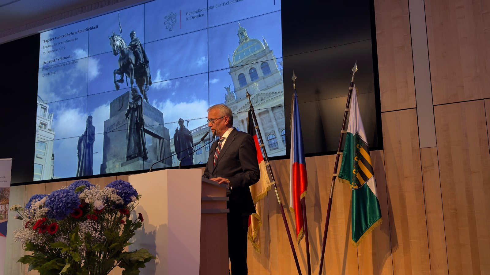 Der Ministerpräsident des Freistaates Sachsen, Michael Kretschmer, und der Minister für Europäische Angelegenheiten der Tschechischen Republik, Martin Dvořák, eröffneten mit ihren Grußworten den festlichen Empfang des Generalkonsulats anlässlich des Tages der tschechischen Staatlichkeit, der am 23. September 2025 in den Räumlichkeiten der Handwerkskammer in Dresden stattfand.