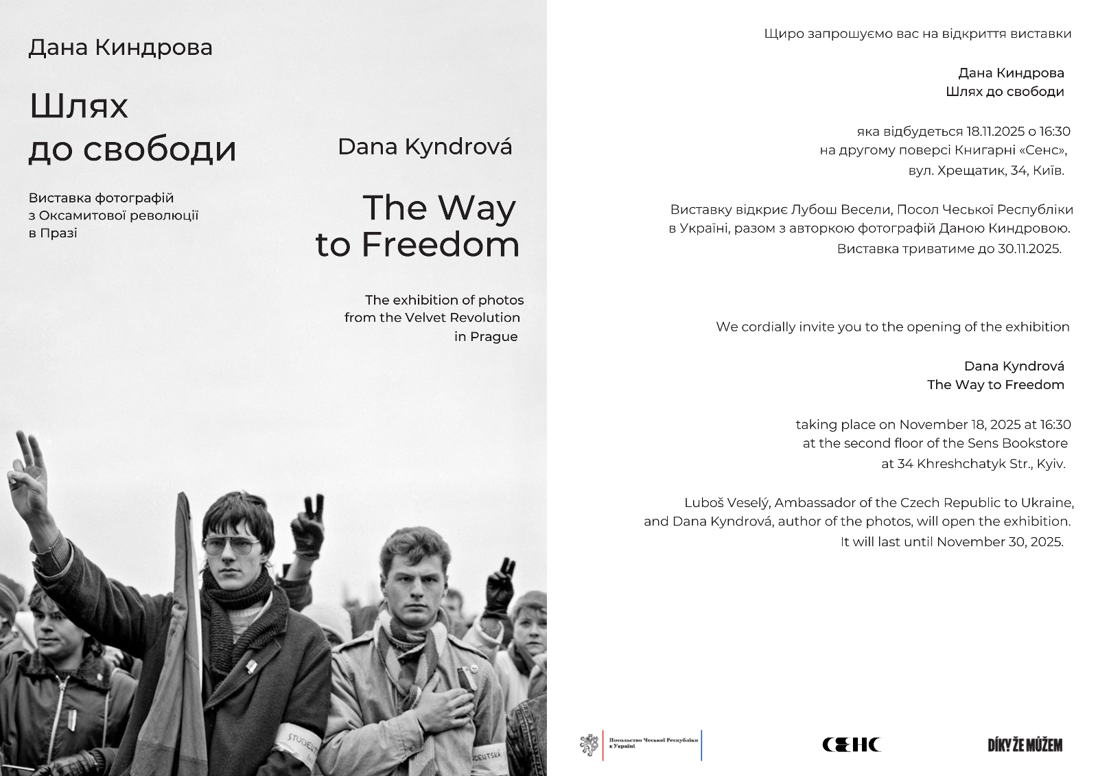 Vernisáž, kterou české velvyslanectví v Kyjevě pořádá v rámci oslav Dne boje za svobody a demokracii ve spolupráci se spolkem Díky, že můžem, se odehraje v úterý 18. listopadu 2025 od 16:30 v knihkupectví Sens na kyjevském Chreščatyku. Kromě fotografky Dany Kyndrové vernisáž zahájí také český velvyslanec Luboš Veselý.
