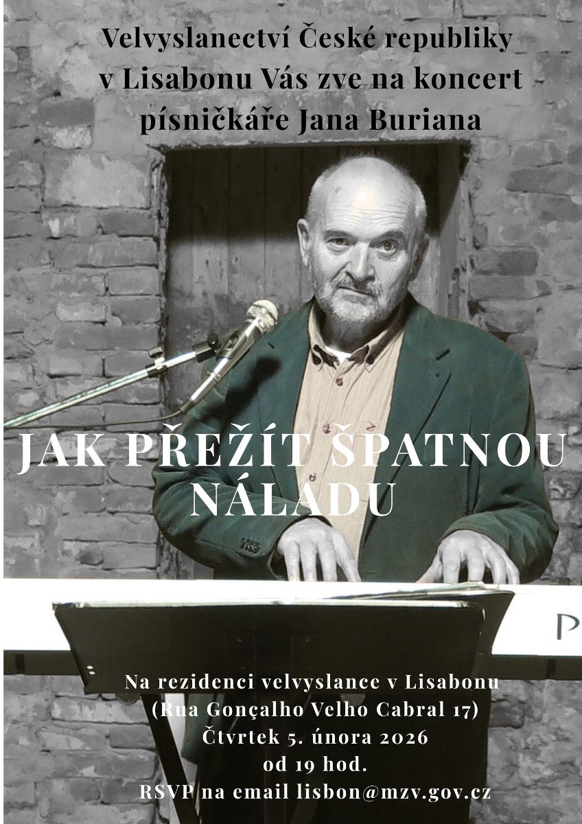 Velvyslanectví České republiky v Lisabonu Vás zve na koncert písničkáře Jana Buriana.