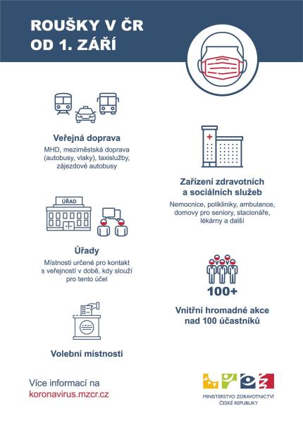 Dovolujeme si informovat, že od 1. září 2020 je v ČR v rámci prevence opět zavedeno částečné nošení roušek.