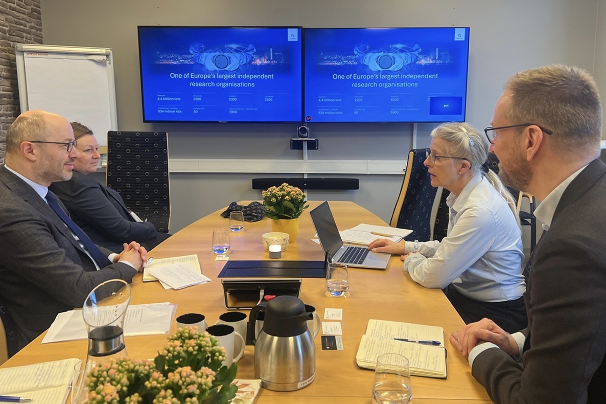 Druhou navštívenou institucí byl SINTEF, který funguje jako největší nezávislý institut v severní Evropě propojující vědu se soukromým sektorem. Z šesti jeho hlavních výzkumných oblastí (community, energy, industry, manufacturing, ocean, digital) se jednání velvyslance Červenky zaměřilo na průmysl a energetiku. S viceprezidentkou SINTEF Industry Eli Aamot a ředitelem komunikace Steinem Mortensholmem hovořil o možnostech další spolupráce v oblasti digitalizace, energetiky, nových materiálů, biotechnologií a aplikovaného výzkumu. Zástupci SINTEF zdůraznili, že jeho propojení s průmyslem vytváří vhodné prostředí pro společné projekty financované z programů EU i z Fondů EHP a Norska. Mezi aktuální příklady spolupráce SINTEF s českými institucemi patří projekty v oblasti kritických surovin (DIAMO), cirkulární ekonomiky a recyklace (VŠCHT Praha, VŠB‑TU Ostrava), pokročilých materiálů a nanotechnologií (ČVUT, Akademie věd ČR) či medicínských aplikací nanovláken (firma InoCure). Dále probíhá spolupráce v oblasti palivových článků a energetických technologií a zapojení českých firem do projektů Evropského obranného fondu. V SINTEF Energy navázal velvyslanec Červenka na diskuze s viceprezidenty Petterem Støou a Nilsem Røkkem, kteří ocenili dlouhodobé partnerství s českými institucemi a vyzdvihli možnosti další spolupráce v oblasti energetických technologií, elektrické dopravy a výkonové elektroniky.