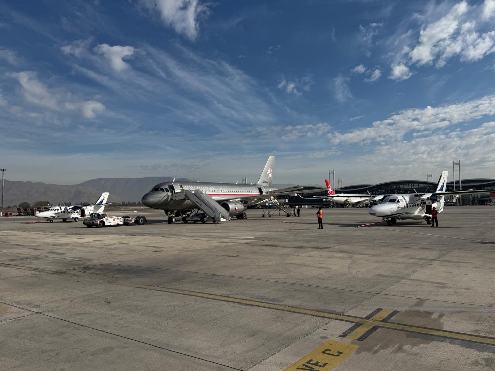 Díky spolupráci firmy Omnipol se s prezidentskou delegací při odletu ze Santiaga loučily i dva nové letouny L-410NG, které v Chile nakoupil a provozuje jejich místní partner společnost Aerocardal.