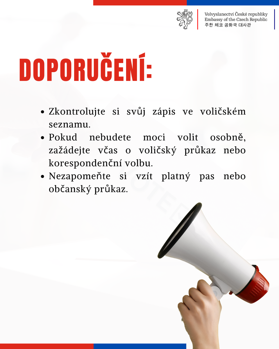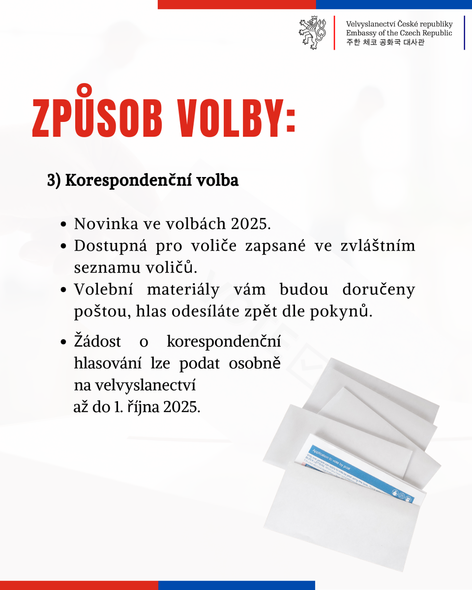 - Můžete si zažádat o voličský průkaz přímo na velvyslanectví v Soulu – nejpozději do 29. 9. 2025 (osobně).