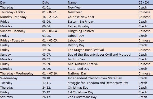 List of Czech and Chinese public holidays, which modify standard business hours for visa and consular services.