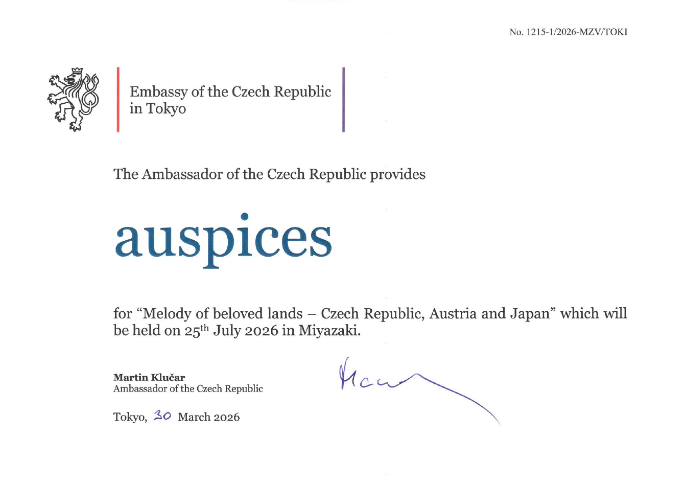 Velvyslanec České republiky v Japonsku uděluje záštitu nad koncertem "Melody of beloved lands - Czech Republic, Austria and Japan", který se koná 25. července 2026 v Miyazaki.