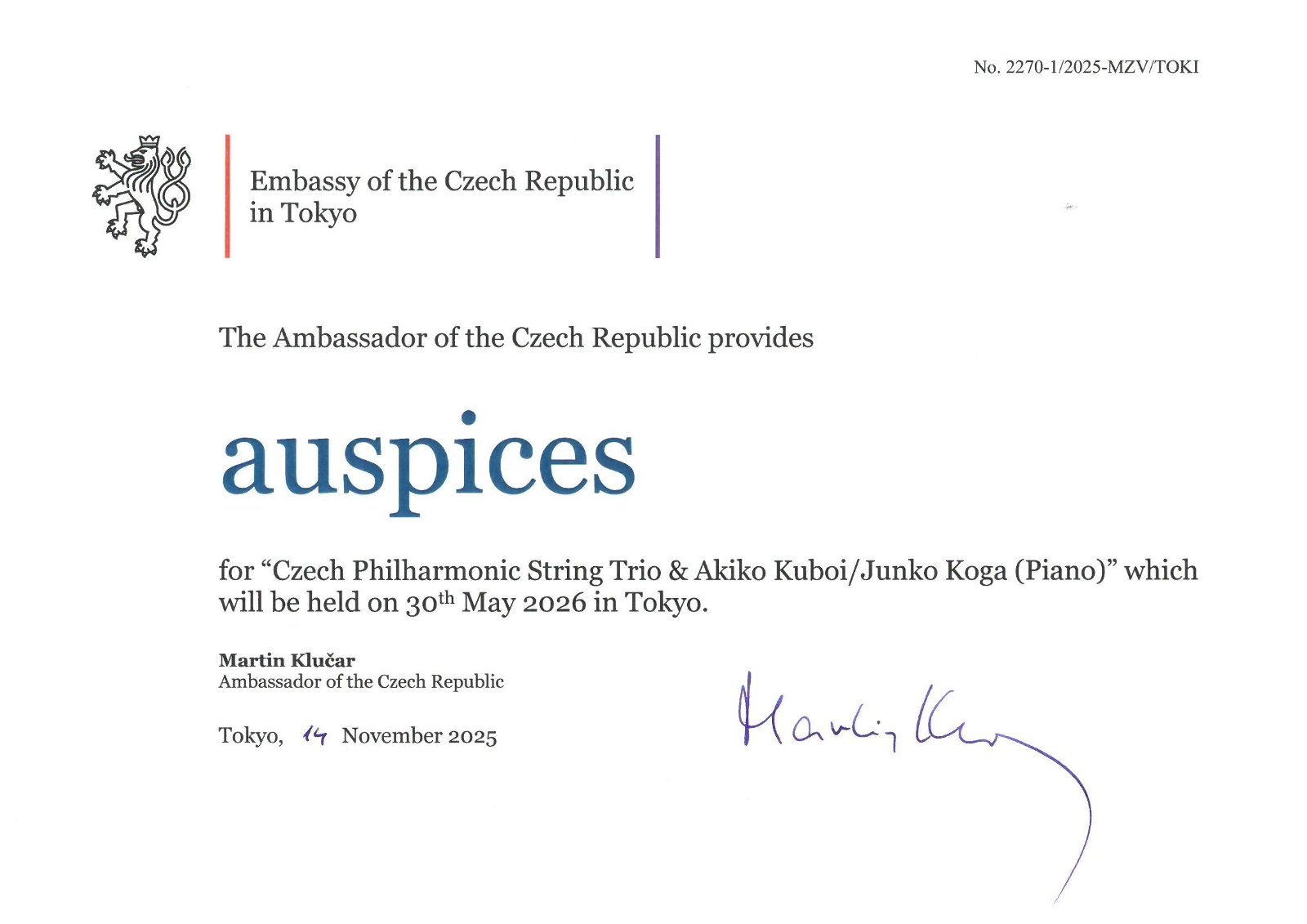 The Ambassador of the Czech Republic to Japan provides auspices for "Czech Philharmonic String Trio & Akiko Kuboi/Junko Koga (Piano)", which will be held on 30th May 2026 in Tokyo.