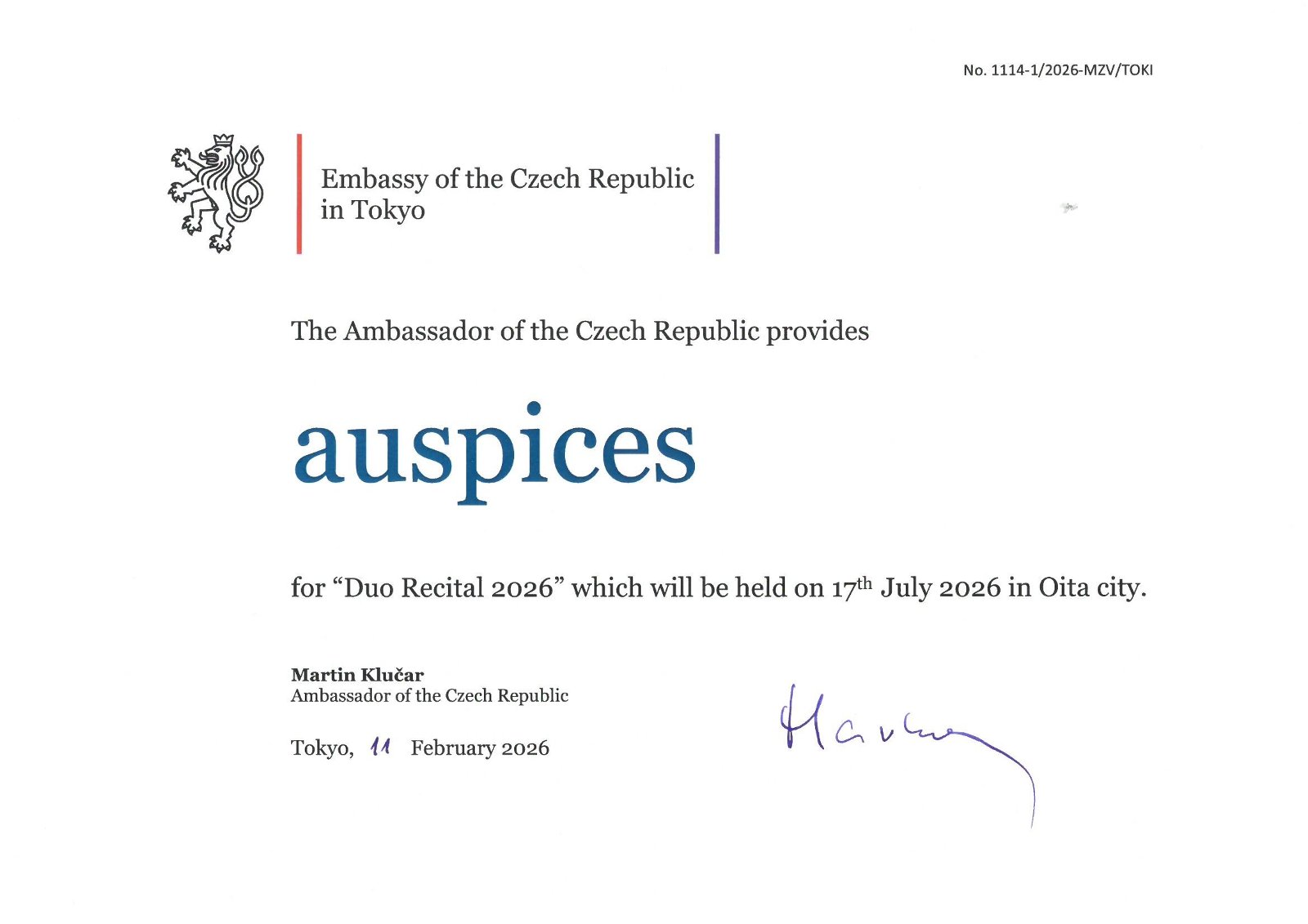 The Ambassador of the Czech Republic to Japan provides auspices for "Duo Recital 2026", which will be held on 17th July 2026 in Oita city.