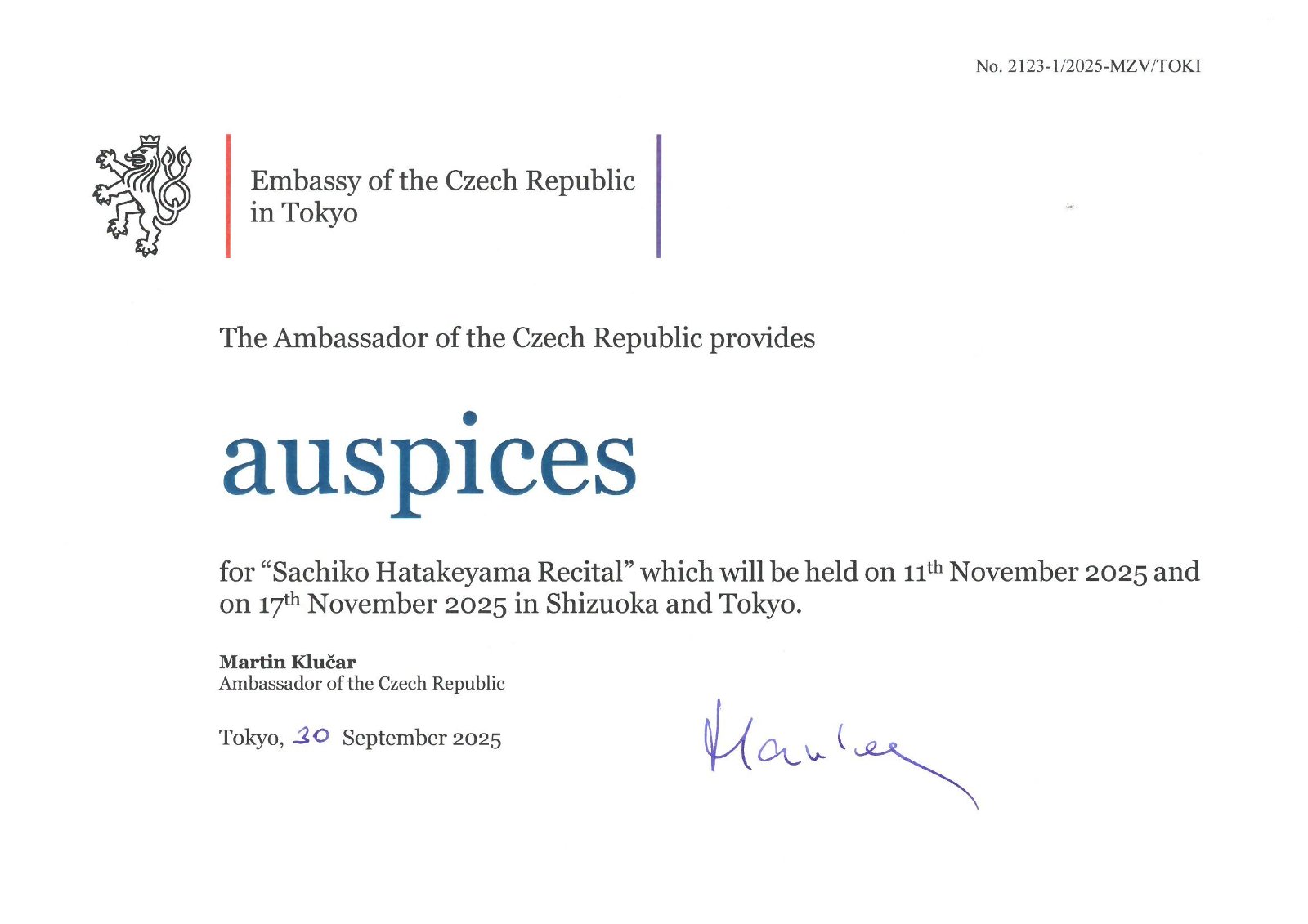The Ambassador of the Czech Republic to Japan provides auspices for "Sachiko Hatakeyama Recital", which will be held on 11th November 2025 in Shizuoka and on 17th November in Tokyo.