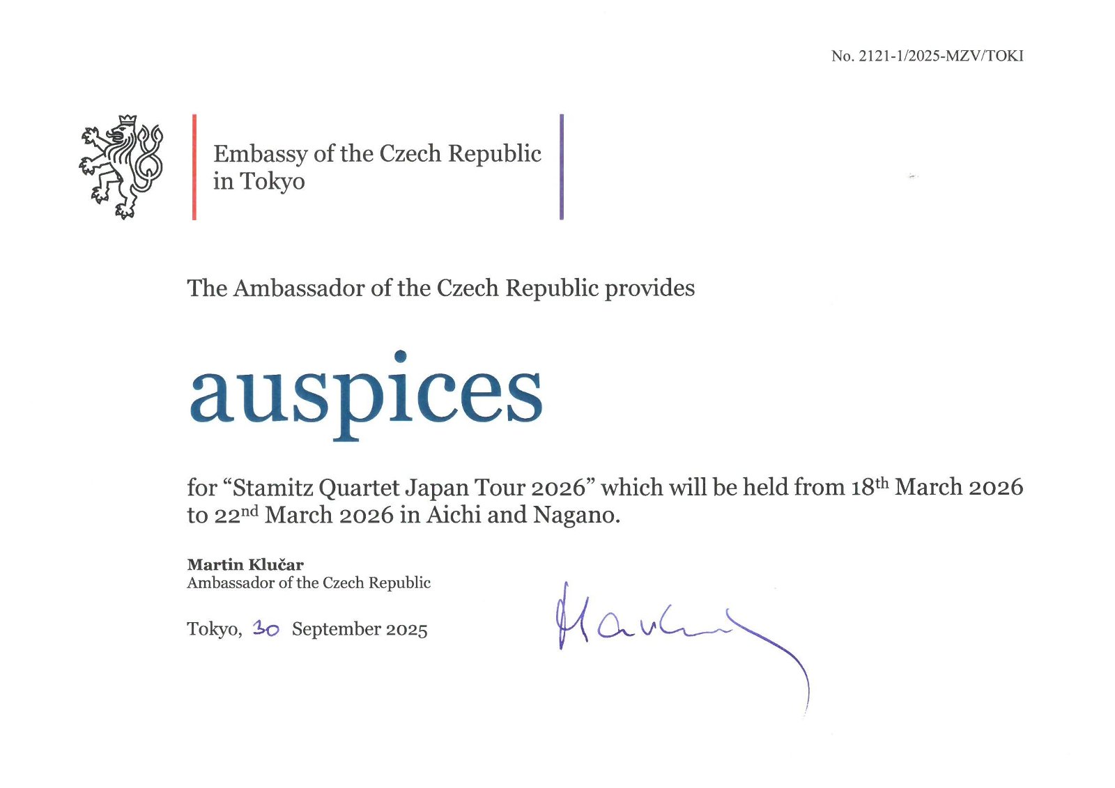 The Ambassador of the Czech Republic to Japan provides auspices for "Stamitz Quartet Japan Tour 2026", which will be held from 18th March to 22nd March 2026 in Aichi and Nagano.