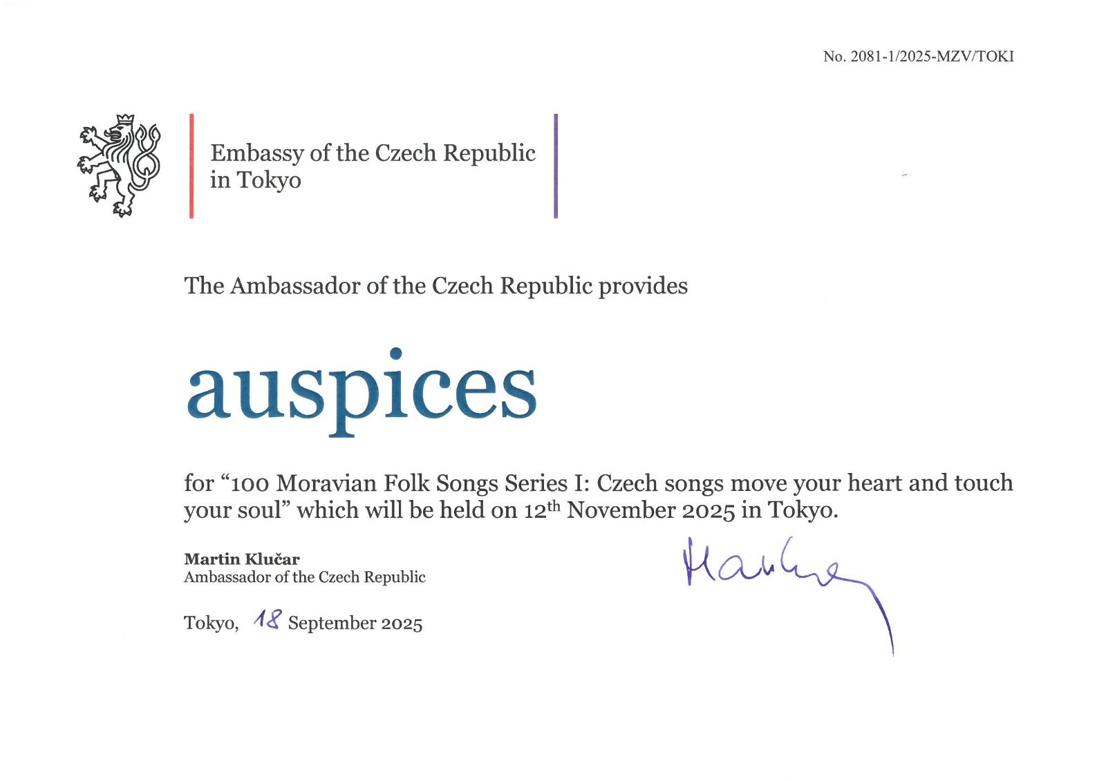 「モラヴィア民謡100曲シリーズⅠ~心躍り 心に響く チェコの唄」を後援 21.09.2025 / 03:27 | Aktualizováno: 21.09.2025 / 03:32 駐日チェコ共和国大使は、2025年11月12日にチェコ大使館で行われる「モラヴィア民謡100曲シリーズⅠ~心躍り 心に響く チェコの唄」を後援しています。 「モラヴィア民謡100曲シリーズⅠ」を後援