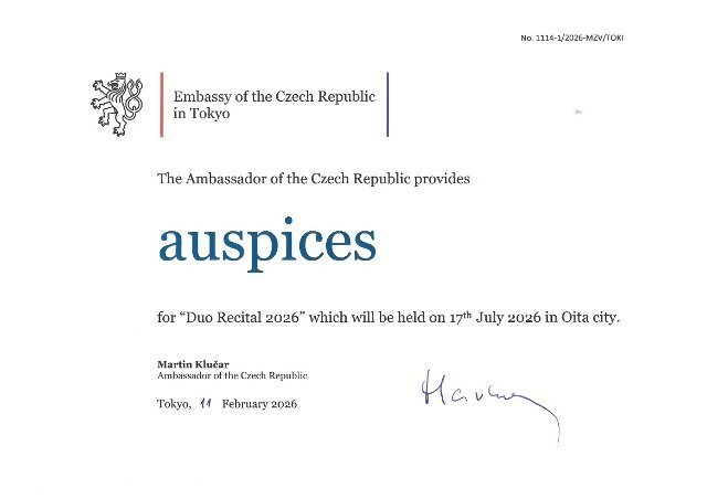 「フルートとピアノによるデュオリサイタル 2026」を後援 16.04.2026 / 08:04 | Aktualizováno: 17.04.2026 / 02:53 駐日チェコ共和国大使は、2026年7月17日に大分市のIichiko音の泉ホールで行われる「フルートとピアノによるデュオリサイタル 2026」を後援しています。 「フルートとピアノによるデュオリサイタル 2026」を後援