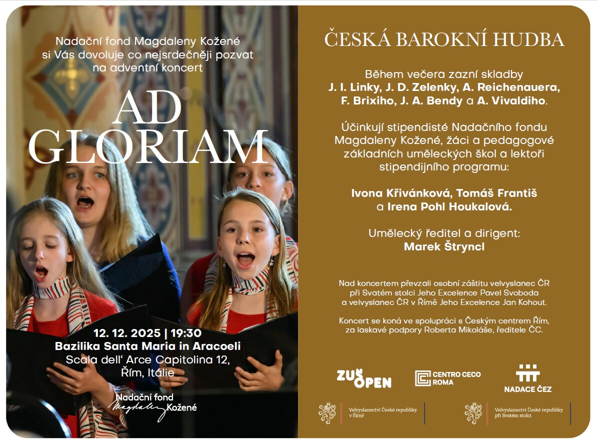 Velvyslanectví České republiky při Svatém stolci ve spolupráci s Nadačním fondem Magdaleny Kožené, Velvyslanectvím České republiky v Itálii a Českým centrem v Římě má čest pozvat všechny zájemce na slavnostní adventní koncert české barokní hudby v podání nejtalentovanějších žáků z českých základních uměleckých škol.