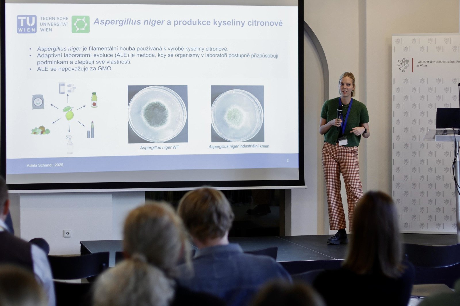 Po úvodních slovech přednesla Eva Přáda Brichtová první keynote přednášku s názvem „Agregrace proteinu a já“ z oboru biochemie a bioinženýrství. Po dokončení svého doktorského studia na Univerzitě v Cambridge působí Eva Přáda Brichtová v současné době na Technické univerzitě Vídeň. Přítomným poskytla zajímavé nahlédnutí do své výzkumné činnosti, která se zaměřuje na zpracování a produkci proteinových agregátů v bakteriích, včetně role inkluzních tělísek, skládání proteinů a využití analytických metod k charakterizaci biomolekul.